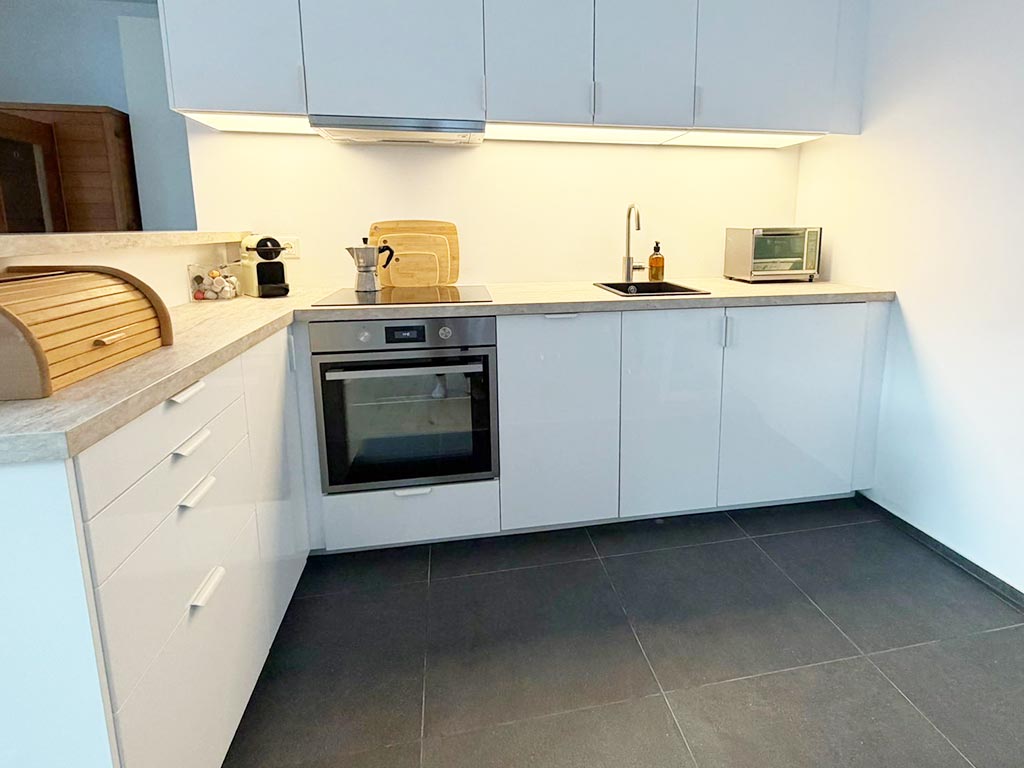• Komplett ausgestattete Küche (Herd, Backofen, Kühl- und Gefrierschrank, Kaffeemaschine, Geschirrspüler)